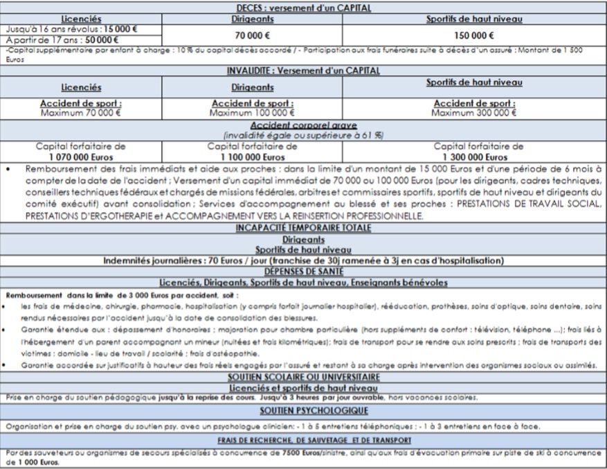 dirigeants et athlètes de haut niveau). Ce capital santé est disponible en totalité à chaque accident. S’il a été entamé ou épuisé à l’occasion d’un premier accident, il se reconstitue en cas d’accident ultérieur. L’assuré pourra disposer de ce capital pour le remboursement, après intervention de ses régimes de prévoyance obligatoire et complémentaire, et sur justificatifs, de toutes les dépenses suivantes sous réserve qu’elles soient prescrites médicalement et directement liées à l’accident pris en charge : Dépassements d’honoraires médicaux ou chirurgicaux, prestations hors nomenclature ou non remboursables par la Sécurité Sociale / Bris de lunettes et perte de lentilles durant les activités sportives / Dents fracturées / Prothèses déjà existantes nécessitant une réparation ou un remplacement, En cas d’hospitalisation : majoration pour chambre particulière (les suppléments divers de confort personnel : téléphone, télévision, etc. ne sont pas pris en compte) / si le blessé est mineur : le coût d’hébergement d’un parent accompagnant facturé par l’hôpital, ainsi que les frais de trajet dans la limite de 0,25 € par km, Frais de transport pour se rendre aux soins prescrits médicalement, dans la limite de 0,25 € par km /Frais de transport des accidentés pour se rendre de leur domicile au lieu de leurs activités scolaires, universitaires, professionnelles, dans la limite de 0,25 € par km / Frais de séjour médicalement prescrits en centre de rééducation traumatologique sportive / Frais d’ostéopathie (ils devront être prescrits et pratiqués par un médecin praticien) Et d’une façon générale tous frais de santé prescrits par un médecin praticien. |