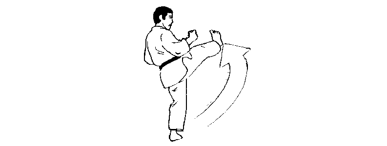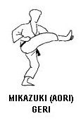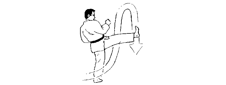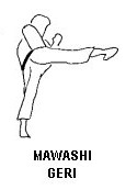 Mawaishi Geri : Coup de pied circulaire en revers. Effectuez une rotation de revers jambe tendue jusqu'à l'impact. Le coup est porté avec le talon. Il faudra ensuite achever rotation et reposer le pied frappeur dans sa position initiale. |