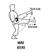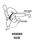 Geri Keikomi : coup de pied arrière défonçant. Ushiro Geri Keage : coup de pied arrière fouetté.Frapper au niveau gedan avec le talon. |