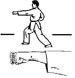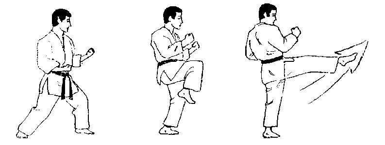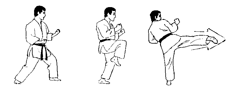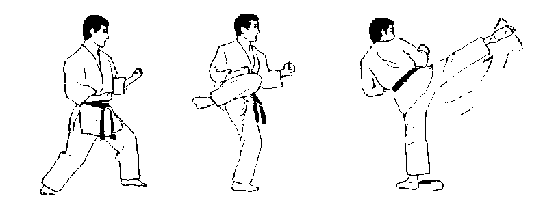 7- Uke effectue Kakae dori/Tori effectue un coup de pieds dans le « bas ventre », Obi Tori Gaeshi, arrive à cheval et donne un coup de poing au visage.