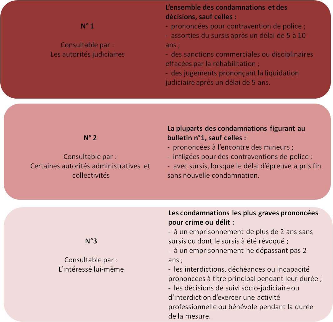 Comment vérifier les incapacités pénales ? Ces condamnations apparaissant sur les bulletins du casier judiciaire. C’est donc par l’intermédiaire de ce dernier que l’on va vérifier les incapacités pénales. Pour se faire, les directions départementales de la cohésion sociale (DDCS) vont automatiquement vérifier le bulletin n°2 de chacune des personnes déclarées comme intervenant par les organisateurs. Il n’est donc plus obligatoire de demander aux animateurs et aux directeurs de fournir le bulletin n°3. Le casier judiciaire national est un fichier informatisé qui mémorise les condamnations prononcées par les juridictions pénales, certaines décisions prononcées par les tribunaux de commerce (liquidation judiciaire, faillite personnelle, interdiction commerciale) et certaines décisions administratives et disciplinaires. Les extraits consultables sont appelés « Bulletins ». Ils sont au nombre de trois (pour demander votre bulletin n°3, cliquez ici) :