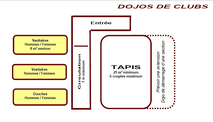 L’Article A 322-141 du Code du Sport relatif aux obligations concernant les salles où sont pratiqués les arts martiaux a été abrogé par le Ministère de la Ville, de la Jeunesse et des Sports le 1er juin 2015. L’AFNOR (Association Française de Normalisation), missionnée par ce même ministère, a élaboré (après travaux en commission de normalisation réunissant des représentants de l’AFNOR, du Ministère et de la FF Jùdô) la norme ci-dessous mentionnée spécifiant les exigences techniques, de sécurité, d’hygiène et de confort liées à la conception, l’aménagement, l’utilisation des salles pour la pratique des arts martiaux :