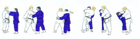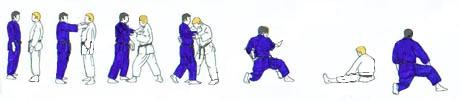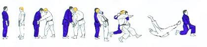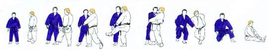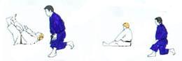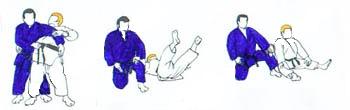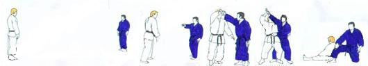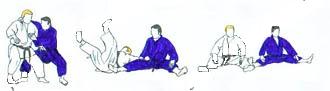 TORI largement en retrait du point central flanc gauche vers SHOMEN. UKE très près, sans avancer, prend de la main gauche le devant de la ceinture de TORI. Et reculant largement le pied droit, tire TORI. Celui-ci réagit en tirant la mâchoire de UKE avec la main gauche et en repoussant la tête avec la main droite, tout en avançant le pied droit derrière UKE. UKE sans avancer le pied arrière, se redresse et pousse vers le bas avec sa main gauche. Dans l'élan TORI se laisse tomber sur le fessier, en fauchant avec sa jambe droite la jambe gauche de UKE qui chute et frappe de la main droite. |