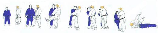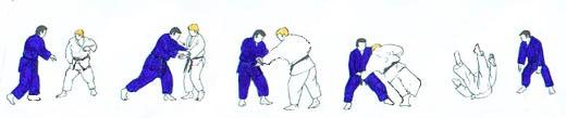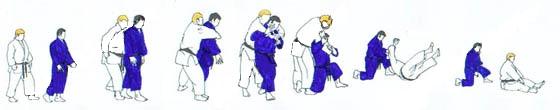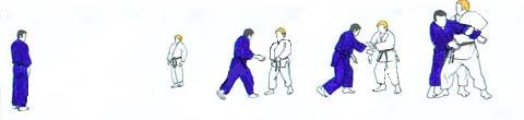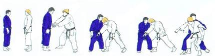 | UKE pivote sur place sur la pointe des pieds pour faire face à TORI, avance de plusieurs pas en commençant du gauche. Arrivé presque à la hauteur de TORI il avance pied droit devant le gauche de TORI, marque un temps d'arrêt, saisit la ceinture de TORI, devant avec la main gauche derrière avec la droite. Tout en levant la jambe gauche qu'il place presque contre le tibia droit de TORI il attire celui-ci, lançant sa jambe gauche en demi-cercle en arrière pour se placer un mouvement de hanche. TORI place son bras gauche derrière le dos de UKE le long de la ceinture. Sa main droite vient appuyer en haut sur le devant gauche de la poitrine de UKE. Partant du pied gauche, par cinq Tsugi ashi il fait reculer UKE et le met progressivement en déséquilibre. À la suite de ces déplacements UKE deux pieds sur le même plan est en déséquilibre, TORI accentue un peu le déséquilibre et poussant de la main droite renverse UKE un arrière en posant lui-même son genou droit au sol un peu derrière son talon gauche. UKE chute en reculant largement sa jambe gauche. TORI après un court temps d'arrêt «ouvre» sa jambe gauche. Puis se relève lentement et revient au même endroit que pour TAI mais un pas environ en retrait par rapport à cette place et un peu plus vers le centre. UKE reprend la même place qu'il avait au début de cette technique. |