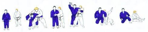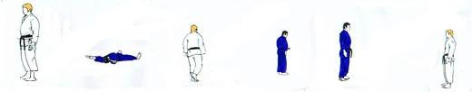 | Les 2 sont à nouveau aux deux bouts de l'axe mais ayant encore changé de place. Ils viennent l'un vers l'autre. C'est TORI cette fois qui en avançant tend le bras droit main profilée pouce dessus TE GATANA. Comme pour transpercer la tête de UKE. UKE pivote et prend de sa main droite la main droite de TORI et passant le pied gauche devant TORI fait Mt de hanche. TORI pousse de sa main droite vers le front de UKE. Sa main gauche vient sur la ceinture, et par un tsugi ashi TORI déséquilibre UKE en arrière (la moitié droite du corps de TORI est derrière la moitié gauche du corps de UKE). TORI se laisse tomber sur son genou gauche et fait chuter UKE en le tirant en arrière. TORI reste immobile un court instant et ouvre son genou droit. |