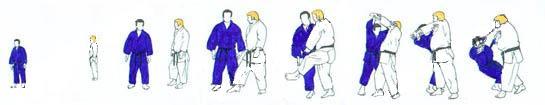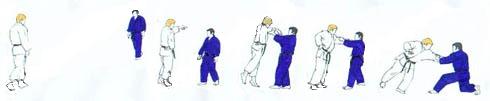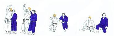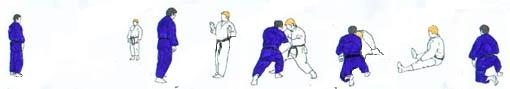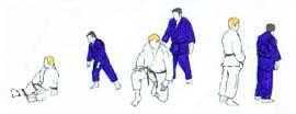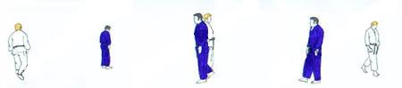 | Les deux partenaires ayant changé de place sont à nouveau aux deux bouts de l'axe. Ils avancent l'un vers l'autre et, arrivé presque à hauteur de TORI, UKE fait un pas plus rapide et tente avec la main droite de placer tsuri goshi au côté gauche de TORI. Celui-ci saisit aussitôt le bras droit de UKE (main gauche en bas à l'extérieur main droite en haut à l'intérieur) et restant face à UKE se laisse tomber sur son genou gauche, en UKI OTOSHI, en tirant le bras vers le sol. |