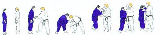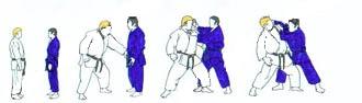 | TORI se relève et revient à la même place que pour RYOKUHI. UKE «fait le tour» et revient devant TORI. Il refait les mêmes gestes d'attaque. Cette fois des deux mains (La saisie du bras de UKE au début la main gauche est à l'extérieur pouce en haut paume vers le haut, main droite à l'intérieur pouce en haut, paume vers le bas) TORI tire le poignet droit de UKE vers l'avant et le bas. UKE avance pied droit puis en réaction se redresse reculant le pied droit. TORI en avançant le pied droit d'un grand pas sur le côté droit de UKE, replie le bras droit de UKE qu'il pousse devant la tête de celui-ci dos de la main contre le front. Son bras gauche lui encercle la taille et, en tsugi ashi déséquilibre UKE. La suite est LE SUTEMI. UKE dès le début de son recul a placé sa main gauche derrière le bras droit de TORI. Il place alors au début du SUTEMI sa main droite sur l'épaule gauche. |