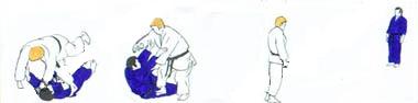 WAKARE, son bras gauche poussant sous l'aisselle gauche de UKE. UKE chute et dans l'élan se redresse et s'élance les deux bras tendus vers TORI qui vient de se relever. |