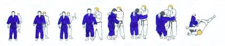 | TORI se relève et vient se placer au bout de l'axe à gauche en regardant SHOMEN. UKE est à l'autre bout. Les deux viennent l'un vers l'autre. En avançant, UKE dissimule sa main droite derrière son dos et tend le bras gauche paume de la main vers la sol. Arrivé vers TORI, ses doigts se replient comme pour «crocheter» devant le cou de TORI. TORI saisit de sa main droite les doigts repliés de UKE. Sa main gauche tire sous le bras gauche de UKE, lequel pied gauche en avant se trouve déséquilibré. TORI alors, passe sa main gauche sur le bras de UKE et laissant tomber son genou droit au sol en UKI OTOSHI et restant bien an face de lui le tire vers le sol. |