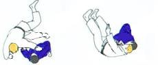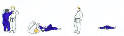 | TORI se place un peu en arrière du point central face à SHOMEN. UKE derrière un peu à gauche à la même distance que pour le technique précédente. Il s'avance comme pour TANI OTOSHI, mais arrivé derrière TORI, comme en JU NO KATA, KATA MAWASHI, il fait tourner les épaules de TORI qui pivote. Les 4 pieds sont «en ligne». Les deux bras de TORI viennent se placer sous les deux bras de UKE et se laissant partir en arrière TORI fait le SUTEMI. UKE chute en avant exactement face à SHOMEN |