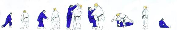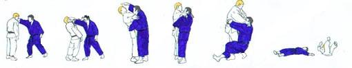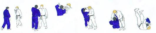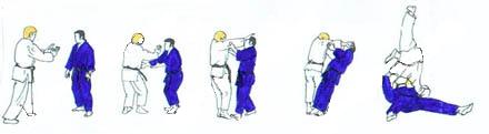 | UKE chute. TORI vient vers lui, puis lui tourne le dos, et avance, UKE s'élance et des deux bras entoure les épaules de TORI. Tombant genou droit au sol, TORI fait SEOI NAGE (SEOI OTOSHI). |