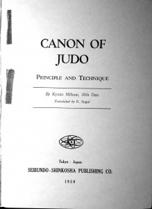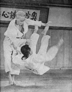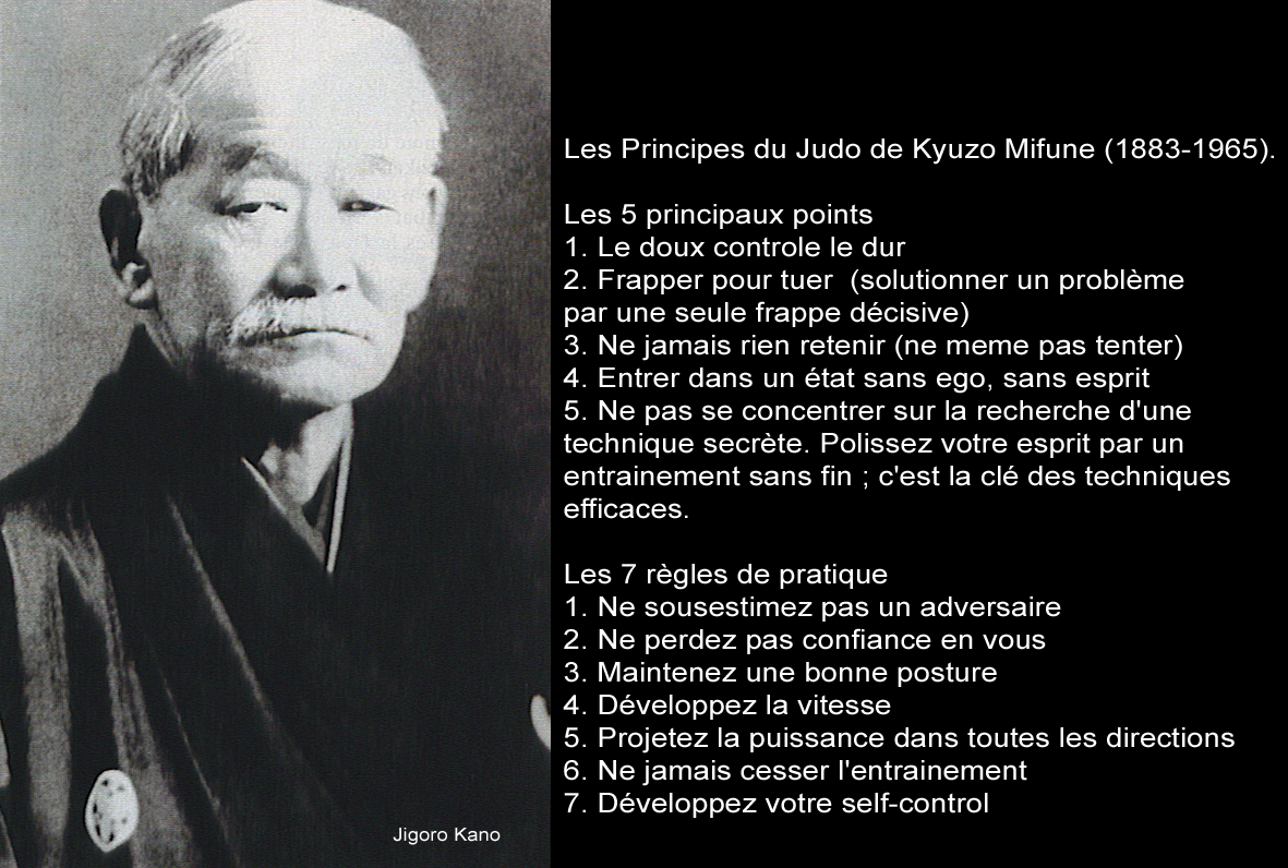 Mifune Kyûzô, l’esprit et… le corps ! (photo : Claude Thibault, Vérités sur le jùdô japonais, Jùdô International, Paris, 1963) Mifune Kyûzô (1883-1965), « L’homme que l’on appelait la divinité du jùdô» (pour reprendre le titre du livre de Shimazu Yoshitada, cf. sources ci-dessous), 10e dan du Kôdôkan, est, pour beaucoup de jùdôkas de par le monde, ce vieil homme chétif, ballotté par ses partenaires de randori et qui, sur une reprise d’opportunité, projette les 8e dan aussi facilement que des benjamins (ici ou ici). Un corps si diaphane qu’il en paraît absent : une technique pure… Si pure que l’on parle volontiers, pour définir son jùdô, de shingi (technique divine) [cf, par exemple, ??????], et que son « spécial » (enfin… un de ses « spéciaux » !) est Kûki Nage ??? (projection aérienne*) : (Timbre commémoratif des Championnats du monde 1956 représentant Mifune Kyûzô exécutant kûki nage) Prodige du jùdô, dont Wikipedia Japon ou le site du Musée Mifune nous apprennent (sans malheureusement proposer de sources) que l’on disait « Kanô pour la théorie, Mifune pour son application », il commence le jùdô au Kôdôkan à 20 ans, en juillet 1903, pour connaître une progression fulgurante : 1er dan en octobre de l’année suivante, 2e en février 1905, 3e en 1906, 4e dan en 1907, 5e en 1909… Puis 6e en 1917, 7e en 1923, 8e en 1931. Il sera 9e dan en décembre 1937, du vivant de Kanô donc, puis 10e dan en mai 1945. Alors, Mifune Kyûzô, pur esprit ? Mifune Kyûzô nous a légué cette image d’une forme idéale du jùdô. Il a également laissé des témoignages écrits, dont les plus célèbres sont sans conteste : Jûdô kaikoroku ????? (Recueil de souvenirs sur le jûdô), 1953 : Dô to jutsu jûdô kyôten, 1954, mieux connu en Occident sous son titre anglais, Canon of jùdô, 1956 :