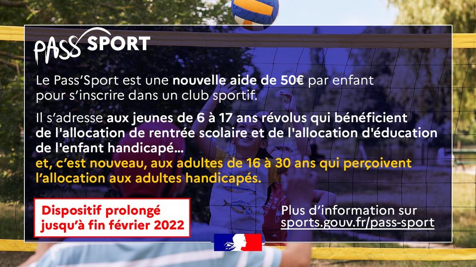 Le 19 mai dernier, le Président de la République officialisait la mise en place du Pass’Sport dont le CNOSF (Comité national olympique et sportif français) a proposé la création. Cette aide de 50 euros à l’inscription dans un club concernera les jeunes de 6 à 17 ans révolus qui bénéficient soit de l’allocation de rentrée de scolaire, soit de l’allocation d’éducation de l’enfant handicapé, soit de l’allocation aux adultes handicapés. Toutes les informations en suivant le lien : https://cnosf.franceolympique.com/cnosf/actus/8532-passsport-mode-demploi-clubs.html