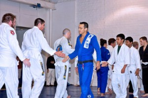 Il n’y a que peu d’étiquette dans les cours de jù-jutsu brésilien, à part le salut de début de cours, cours dans lesquels il n’est pas rare que les gens aillent et viennent sans que cela ne pose de soucis particulier. De la même manière, que ce soit l’échauffement, la partie de travail technique ou le combat, les pratiquants peuvent les faire, ne pas les faire, faire autre chose sans que ce la ne soit choquant.