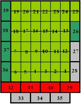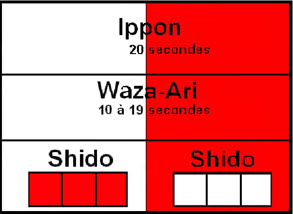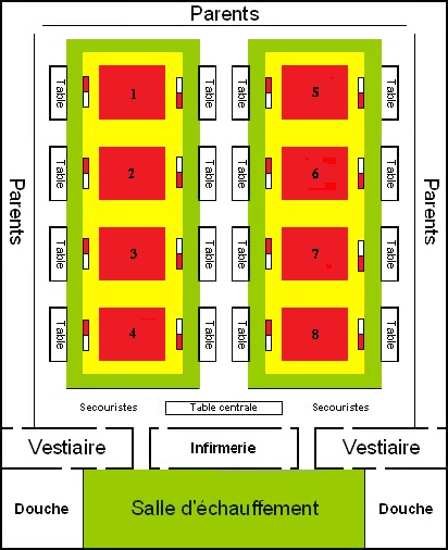 Sur le tableau de marque, le rouge est toujours placé à droite de l'arbitre qui regarde la table et à gauche des commissaires sportifs placés derrière la table.